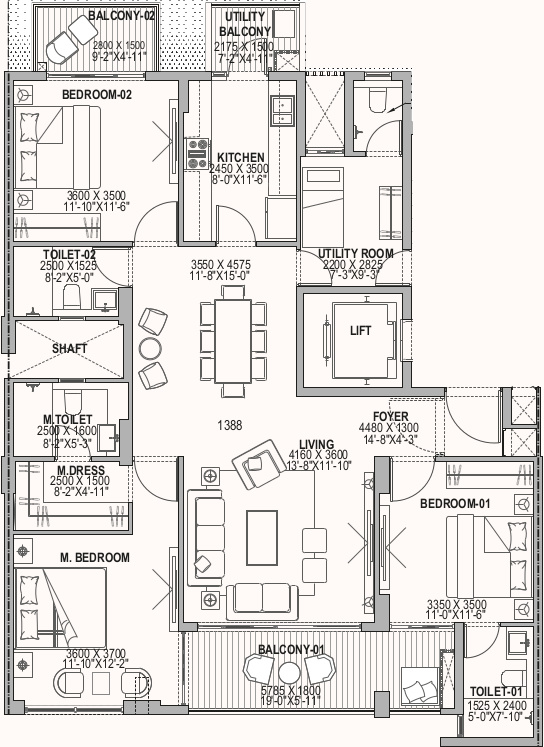 Area : 1105.00 sq.ft. - 1423.00 sq.ft