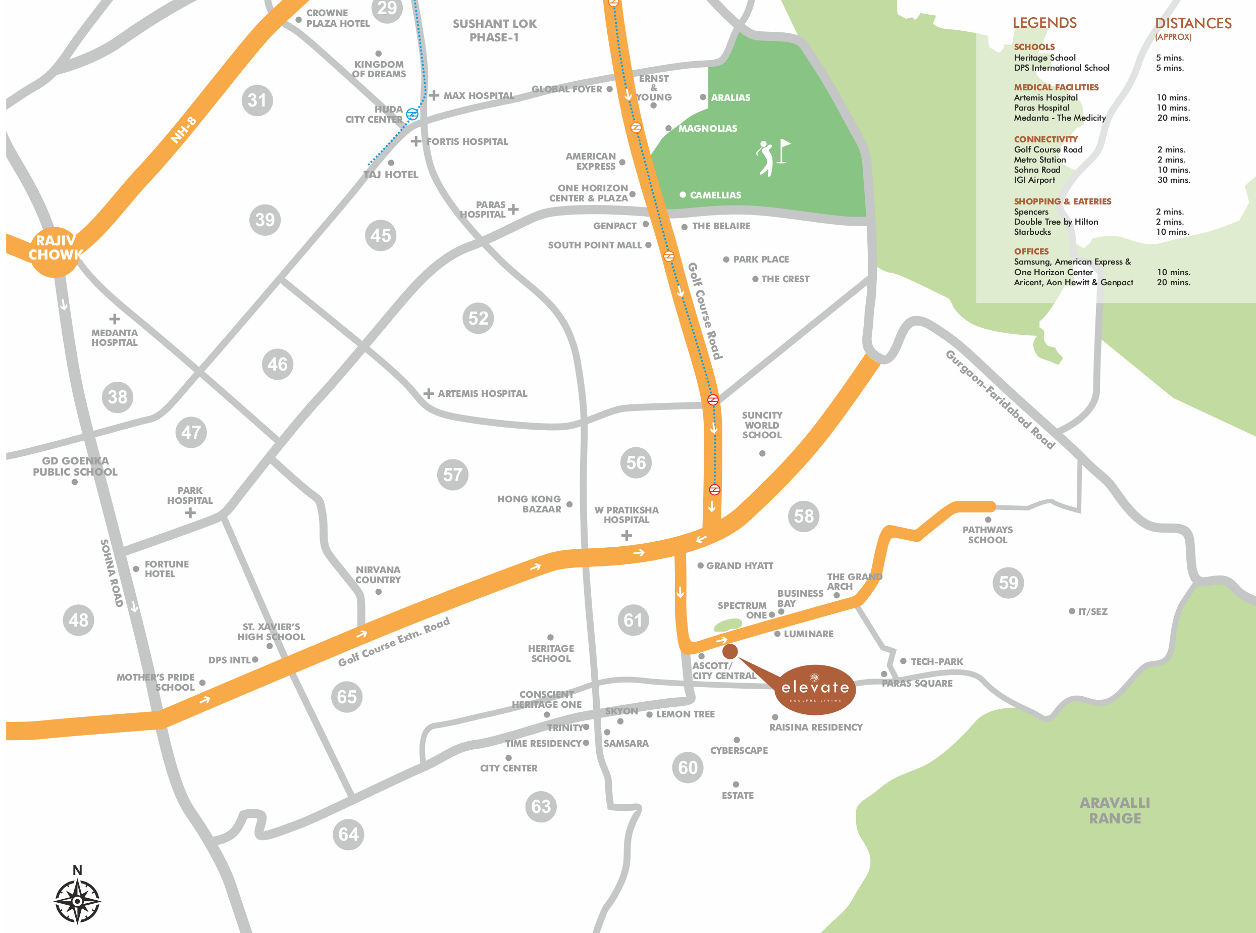Located off the Golf Course Road extension with direct connectivity from both Delhi and Gurugram, Elevate enjoys lush views of the Aravallis, in an upscale neighborhood