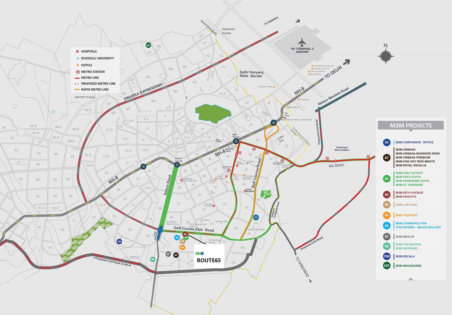 The commercial development is surrounded by premium communities, suburban societies, five-star hotels, educational institutes, hospitals, and much more. Due to its main location and unmatched connectivity, the M3M Route 65 project becomes a seamless place for buyers to invest in commercial property.