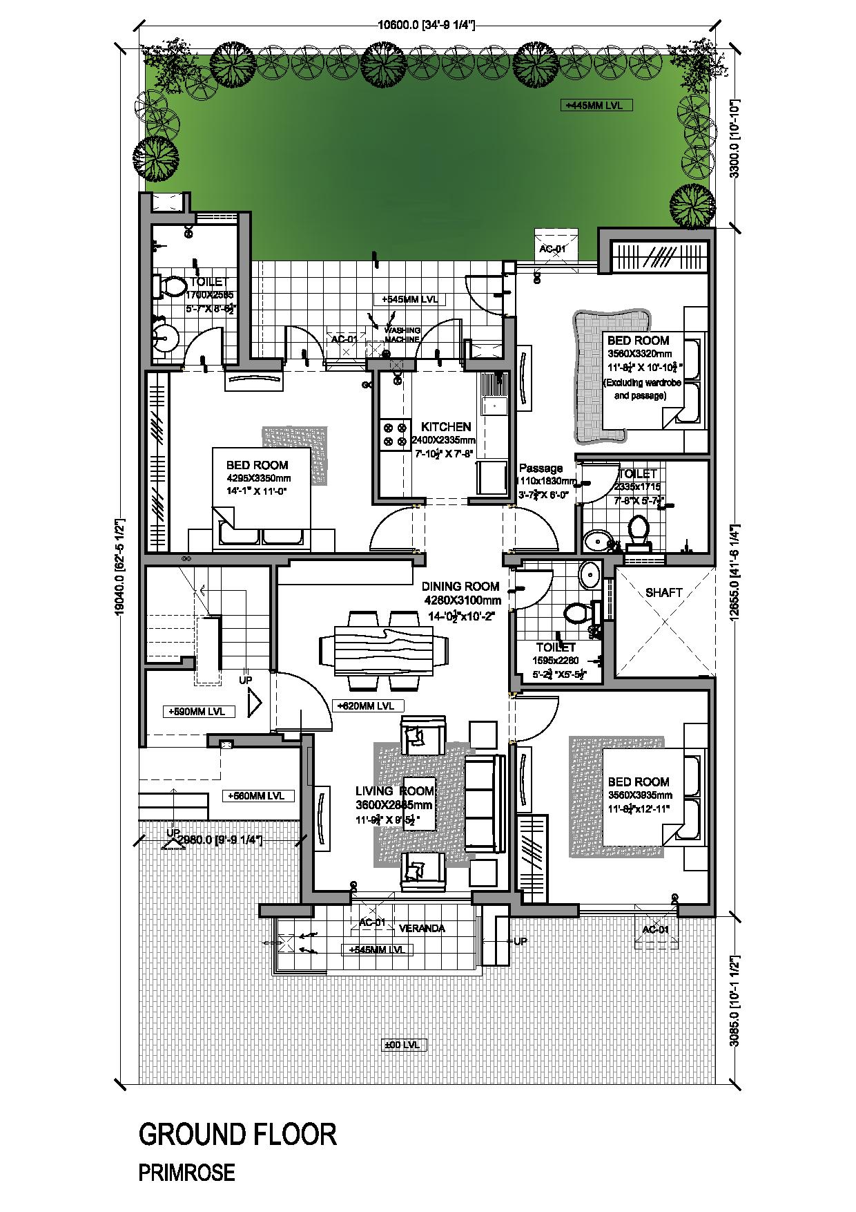 Ground floor gets individual front & back garden with covered verandas.